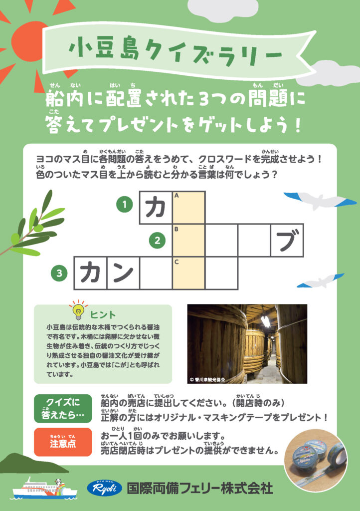 船内3カ所に設置された“小豆島に関するクイズ”を巡って解答を集める体験型ラリーで、専用の解答用紙に答えを記入すると、クロスワードパズルが完成し、小豆島にちなんだ観光ワードが現れます。